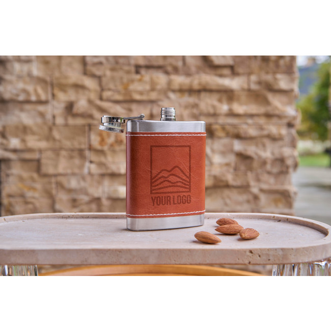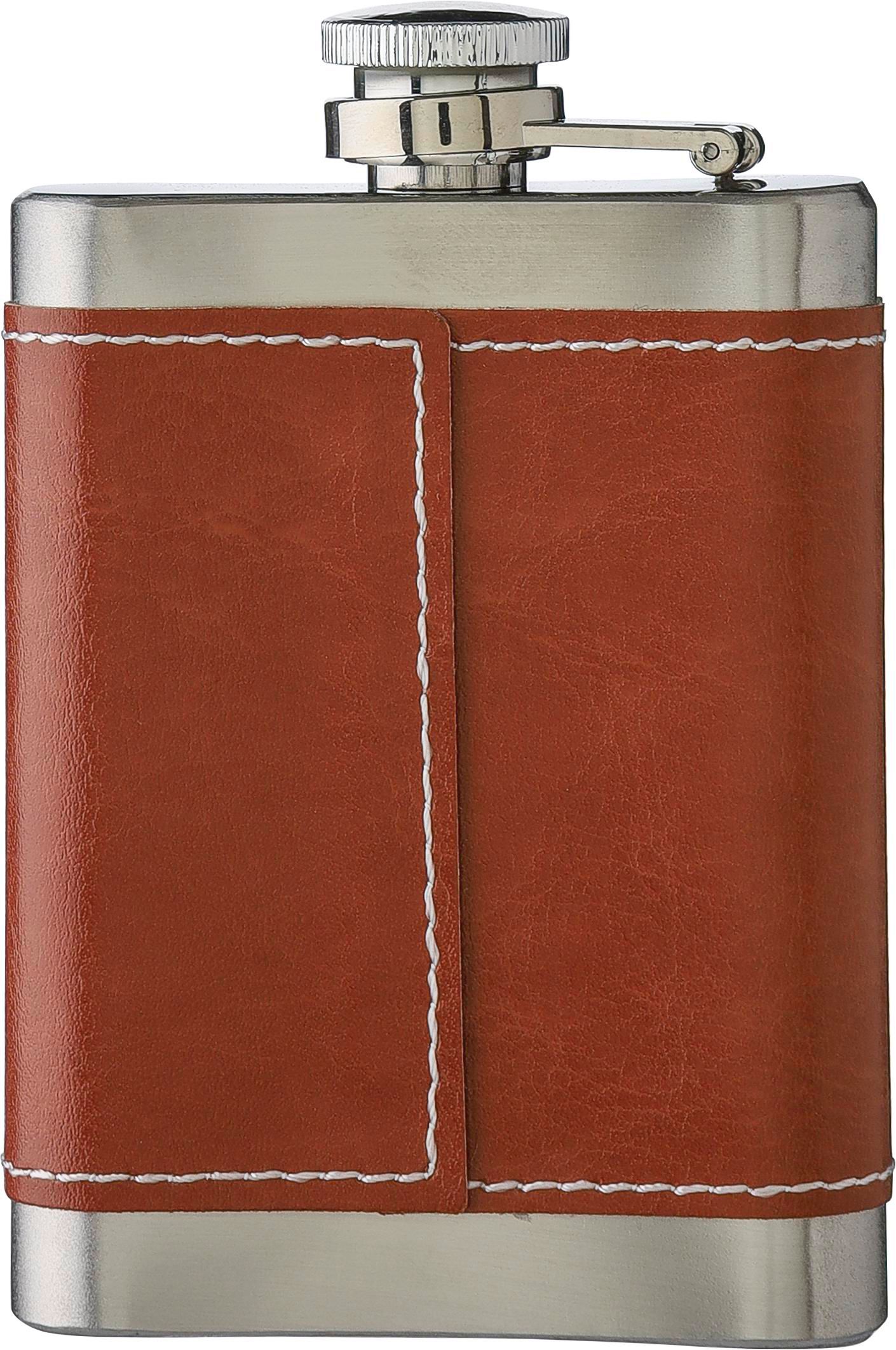 Fiaschetta in acciaio inox 304, include custodia protettiva esterna in PU, confezionata singolarmente in una scatola in cartone avana, capacità 100 ml