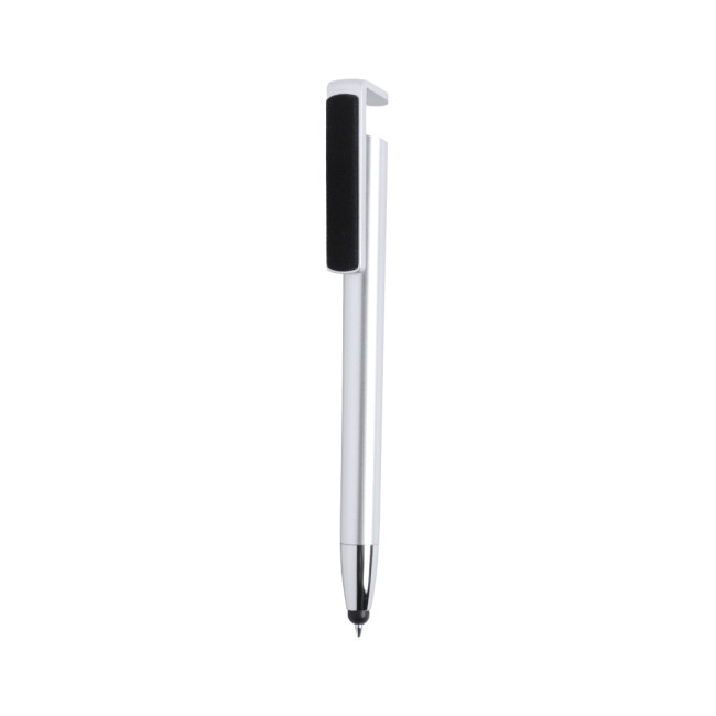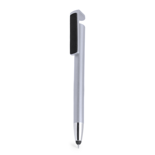 Penna Touch multifunzionale con meccanismo a pulsante, in colori freschi e con clip a doppia funzione, appositamente progettata per fungere da supporto per dispositivi mobili e con pulisci schermo. Fusto con finitura metallizzata, appositamente progettato per la stampa in tampografia e con inchiostro nero.