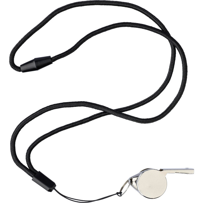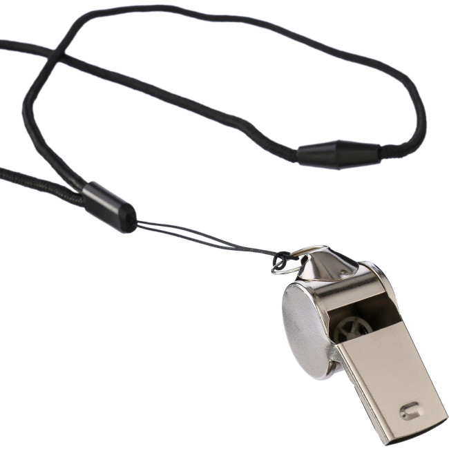 Fischietto in metallo, cordino in poliestere e fibbia di sicurezza in plastica, confezionato singolarmente in una scatola in cartone avana