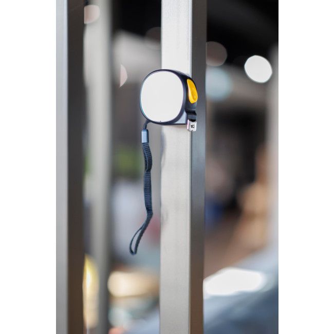 Flessometro ABS da 5 metri, lato magnetico largo 19 mm per un facile fissaggio su superfici metalliche, indicazioni in centimetri e pollici, dotato di pulsante sulla parte superiore per funzione di blocco e rilascio, cinturino da polso in poliestere, confezionato singolarmente in una scatola in cartone avana illustrata.