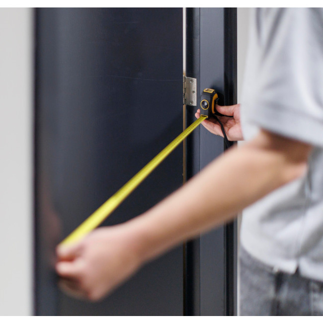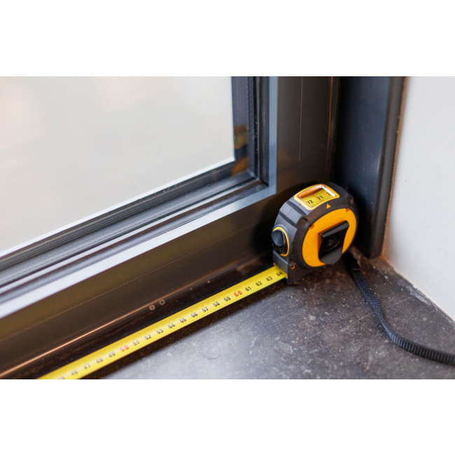 Flessametro in ABS e TPR da 3 metri, nastro metallico largo 16 mm, dotato di finestra trasparente sulla parte superiore per misurazioni interne precise, con nastro stampato su entrambi i lati, funzione di blocco e rilascio, clip posteriore e cinturino da polso in poliestere, confezionato singolarmente in una scatola in cartone avana illustrata.
