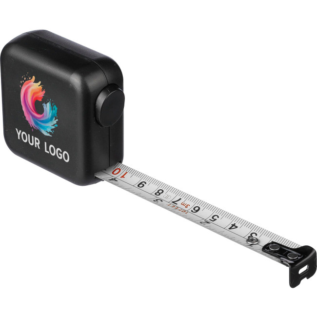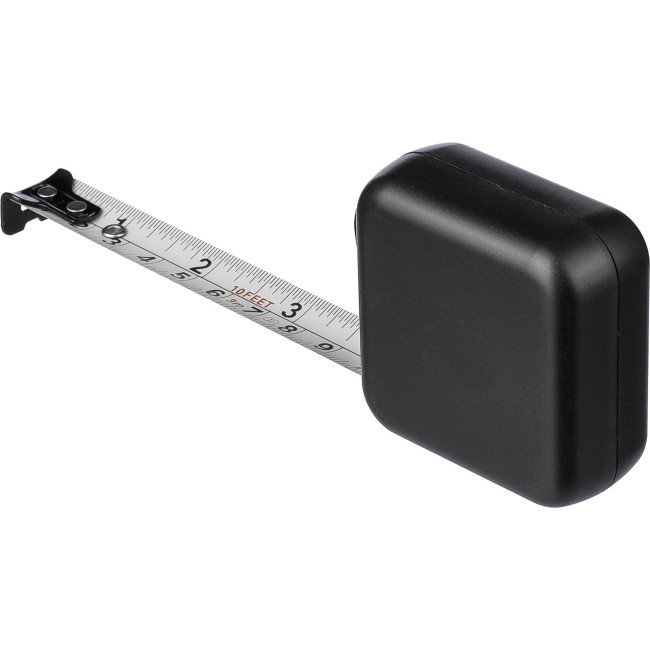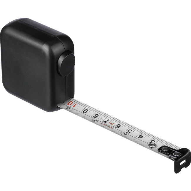 Flessometro in ABS da 3 metri, nastro in metallo (16 mm) con scala in centimetri e pollici, assemblato a ultrasuoni (senza viti), include pulsante con blocco, confezionato singolarmente in una scatola in cartone avana. Sistema metrico in centimetri e in pollici