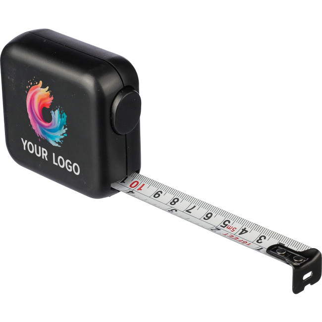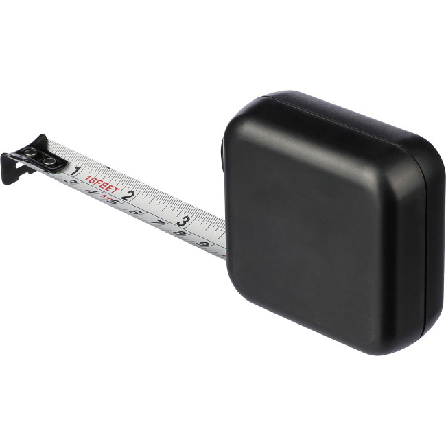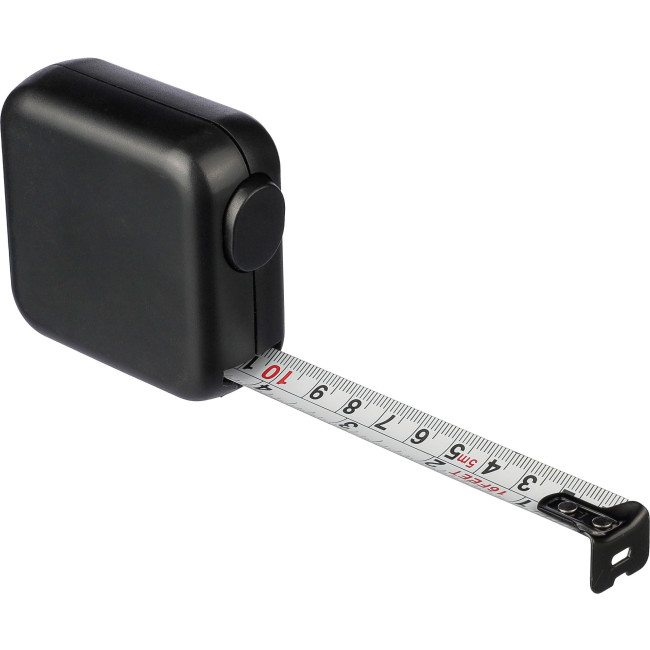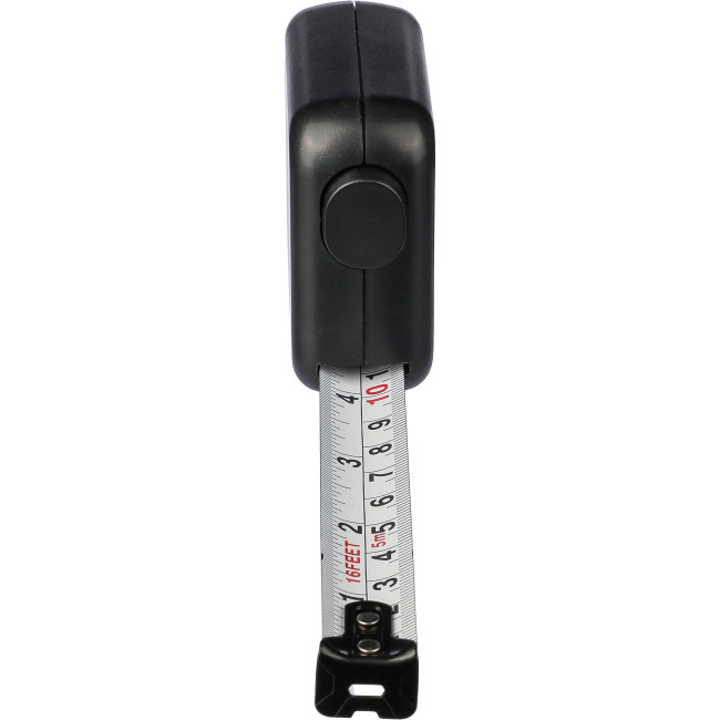 Flessometro in ABS da 5 metri, nastro in metallo (19 mm) con scala in centimetri e pollici, assemblato a ultrasuoni (senza viti), include pulsante con blocco, confezionato singolarmente in una scatola in cartone avana. Sistema metrico in centimetri e in pollici