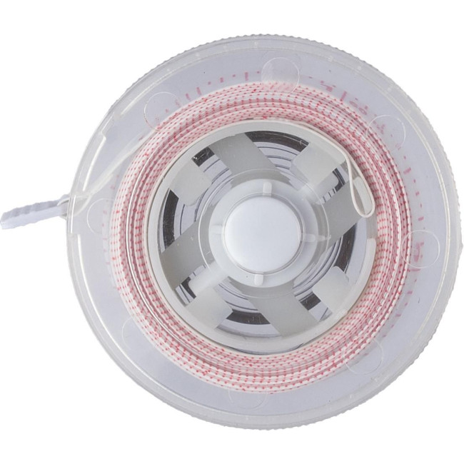 Flessometro in plastica a nastro retrattile da 1,5 metri, custodia trasparente con inserti colorati, include bottone di arresto, la superficie piana sul retro è adatta per la stampa