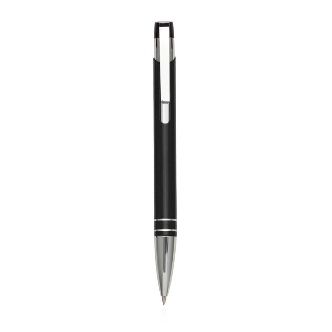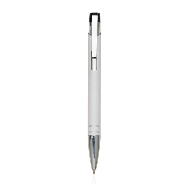 Originale biro con meccanismo a pressione dall'elegante design bicolore. Fusto in alluminio sagomato con finitura liscia in vari colori. Clip curva originale, anelli e punta in color argento. Con cartuccia jumbo e inchiostro blu.