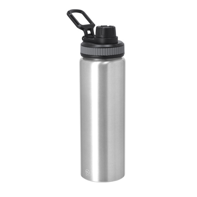 Bottiglia in alluminio riciclato con una capacità di 800 ml. Fornita con tappo a vite nero con impugnatura in silicone grigio per una sigillatura ottimale, distributore e manico regolabile per il trasporto. Con logo in alluminio riciclato.L'alluminio riciclato è un materiale con possibilità di riciclo quasi infinite, senza perdere le sue proprietà originali e consumando meno energia nel processo.Certificazione GRS (Global Recycled Standard), che garantisce l'origine riciclata del materiale utilizzato per fabbricare il prodotto.