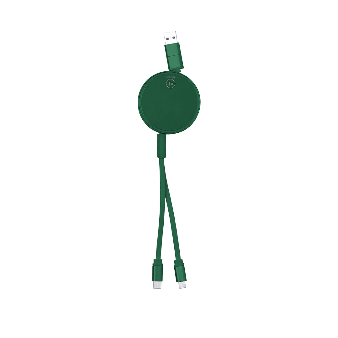 Cavo di ricarica e sincronizzazione estensibile, adatto al trasferimento di dati e realizzato in alluminio riciclato con finitura metallica. Alloggiamento centrale con ampia superficie di stampa, appositamente progettato per l'incisione laser. Disponibile in un'ampia gamma di colori, con cavi coordinati. Connessioni di ingresso di tipo C e USB, con uscite Lightning, Micro USB e Tipo C. 5V DC 2,4A. Confezionato in busta kraft individuale.L'Alluminio Riciclato è un materiale con possibilità di riciclaggio quasi infinite, senza perdere le sue proprietà originali e consumando meno energia nel processo.Certificazione GRS (Global Recycled Standard), che garantisce l'origine riciclata del materiale utilizzato per la fabbricazione del prodotto.