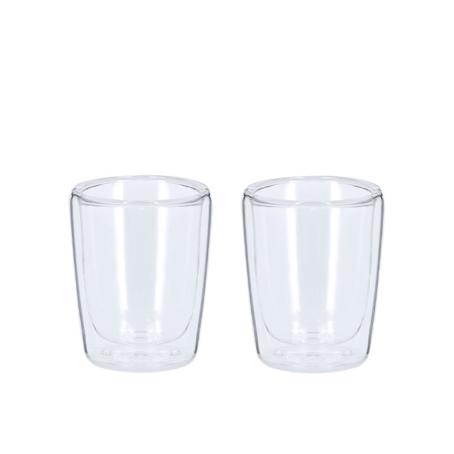 Elegante set di bicchieri in vetro borosilicato a doppia parete. Include due bicchieri, ognuno con una capacità di 65 ml. Presentati in una scatola sagomata.