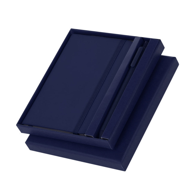 Un set di blocco note e penna fatti di PU. Il set comprende: - Blocco Note realizzato in PU. Include 80 pagine color crema con linee, segnalibro e nastro elastico abbinato per chiusura. - Penna, corpo di colore unito in gomma. Ha una pinza, un meccanismo a pulsante e inchiostro blu.