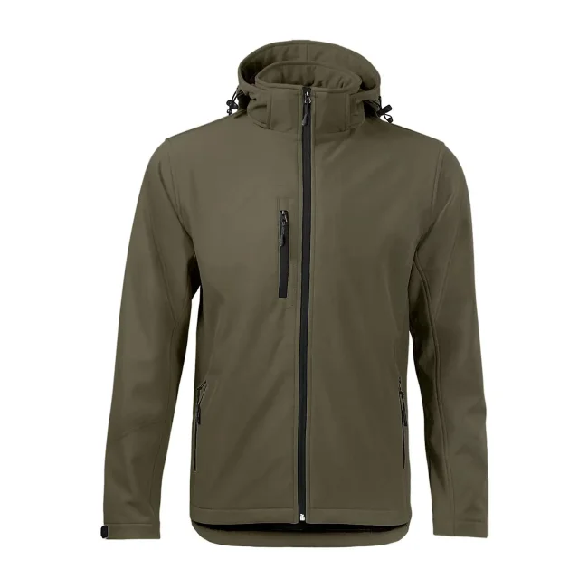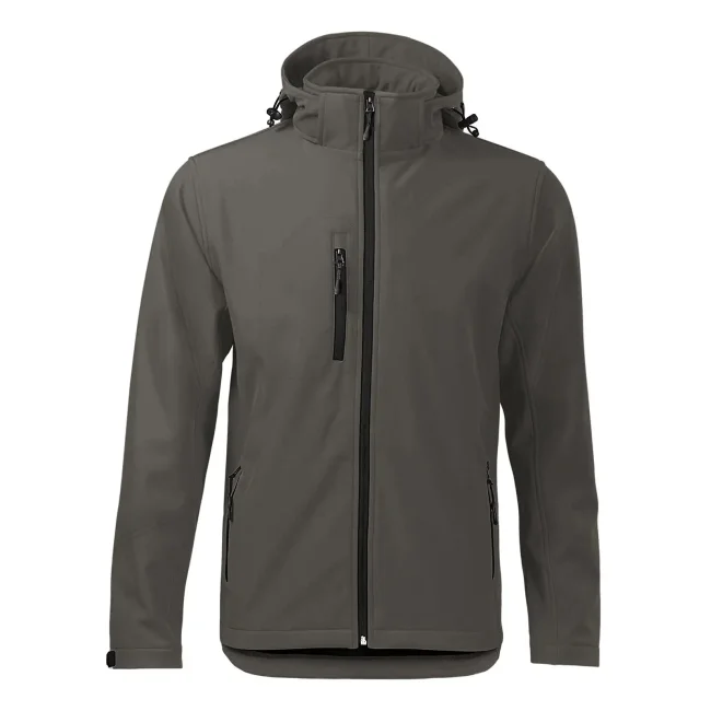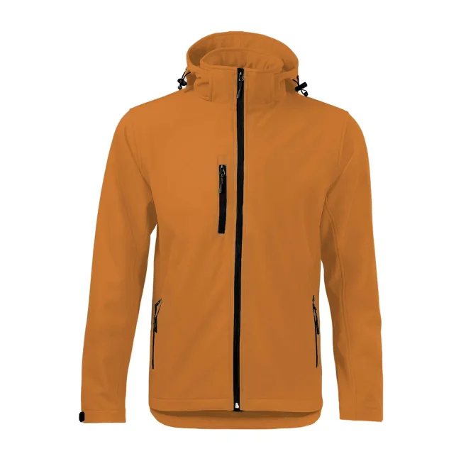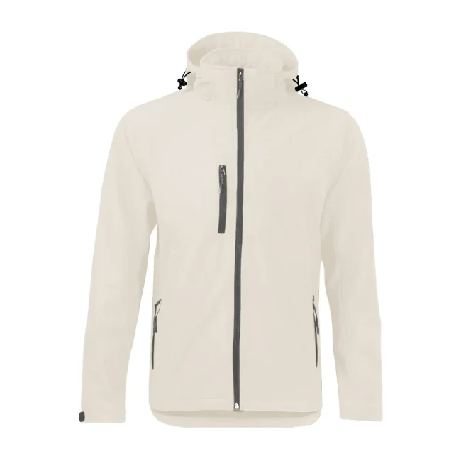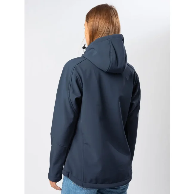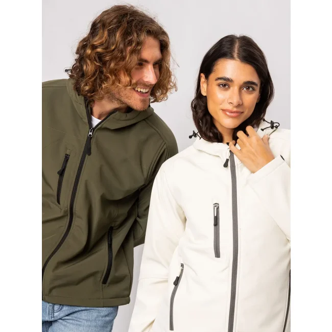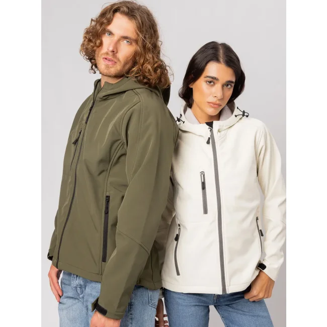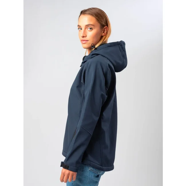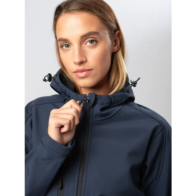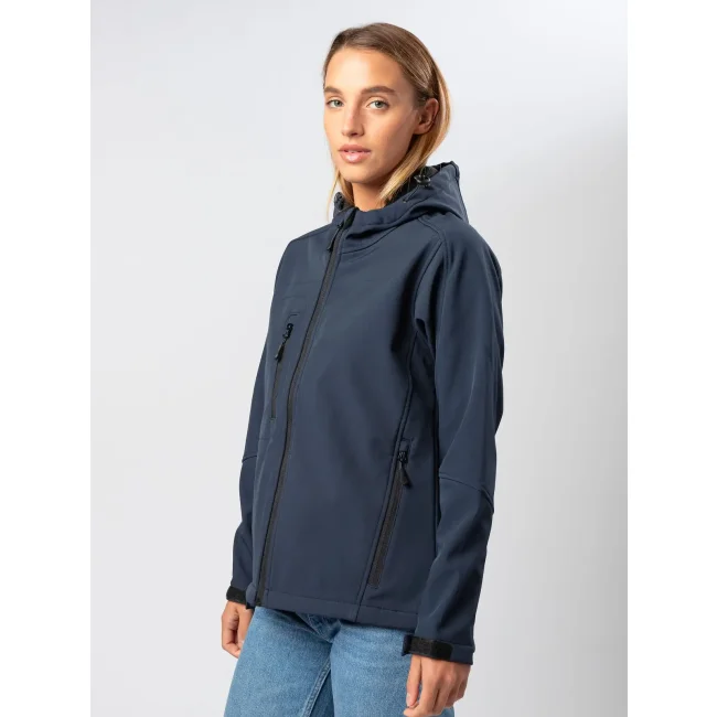 94% poliestere, 6% elastan. Giacca da donna in softshell a 3 strati, cappuccio con fermi in plastica, occhielli e cordino neri.Due tasche laterali con zip, una taschino sul petto con zip, tirazip in plastica, zip interna lato cuore per la personalizzazione, polsini regolabili con velcro, interno in micropile. Bordo inferiore con cordino regolabile con fermi.Impermeabilità 8000 mm, traspirabilità 1000 gr/m2. Etichetta strappabile.