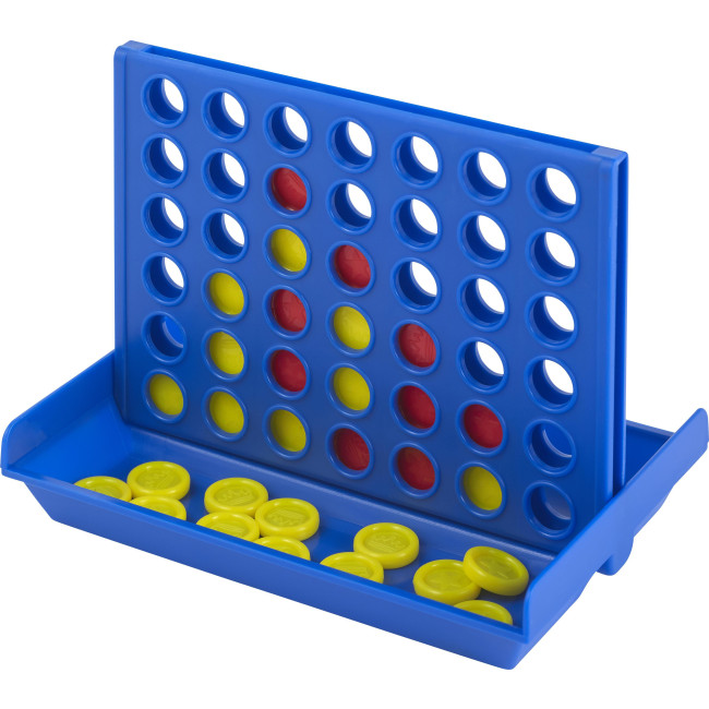 Gioco “Forza 4” pieghevole in ABS, comprende due sacchetti in ABS; uno con 21 pedine gialle, uno con 21 pedine rosse, dimensione da piegato: 13 x 9 x 2,5 cm, confezionato all'interno di un sacchetto in TNT con chiusura a cordoncino