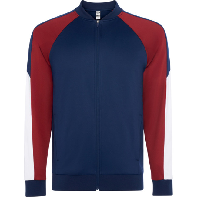 Giacca sportiva con maniche a raglan. Chiusura frontale con zip. Due tasche laterali con chiusura a zip. Colletto, polsini e orlo a coste 1x1. Scollo nastrato a contrasto. Maniche a contrasto con strisce lungo la manica. Opzioni di colore abbinabili al pantalone URUS.
