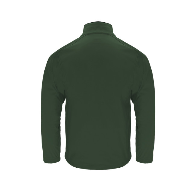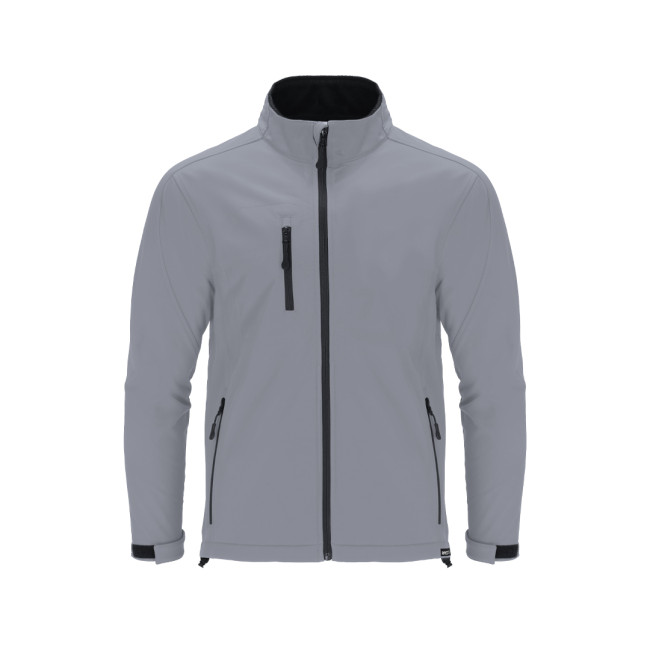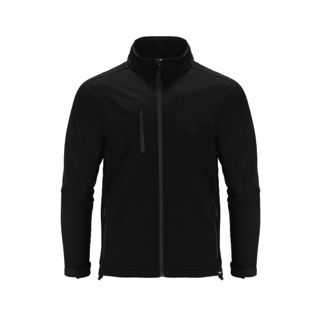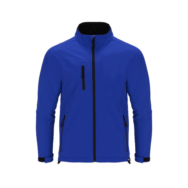 Giacca soft RPET realizzata in 3 strati, 340 g/m². Con membrana da 8000 mm, impermeabile e traspirante. Esterno in Soft Shell e interno in micro pile polar nero. Con tasca esterna sul petto destro e due tasche laterali con zip. Con zip centrale e zip invertiti sulle tasche, inclusi tiranti neri con cordoncino. Maniche raglan con sistema di chiusura a velcro sul polsino in nero. Protettore mento coordinato e cintura regolabile, con elastico e stopper. Etichetta RPET sul bordo del capo.