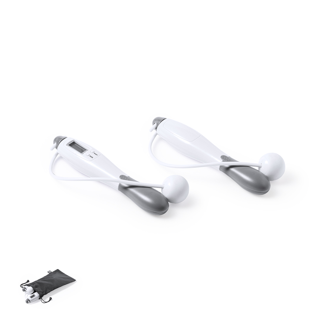 Corda da salto digitale, realizzata in ABS resistente. Con impugnature ergonomiche e display LCD con pulsanti di regolazione. Presentata in una custodia in poliestere RPET con chiusura a coulisse, realizzata in plastica riciclata per promuovere il riutilizzo dei rifiuti plastici e contribuire alla sostenibilità del pianeta. Etichetta distintiva RPET sulla custodia. Alimentazione a batteria (batterie a bottone incluse).