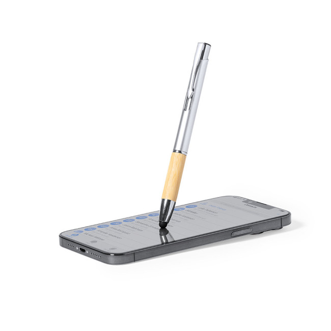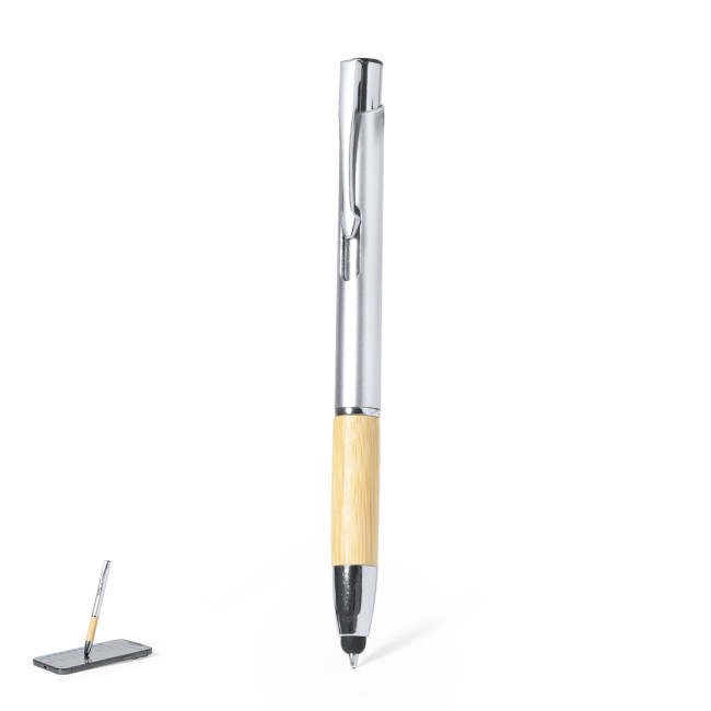 Elegante penna a sfera con puntatore, della linea natura, con meccanismo a pulsante. Corpo in ABS con finitura lucida e impugnatura in bambù, con accessori coordinati. Clip in metallo, con cartuccia jumbo e inchiostro blu.