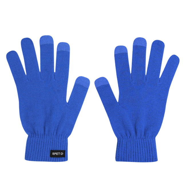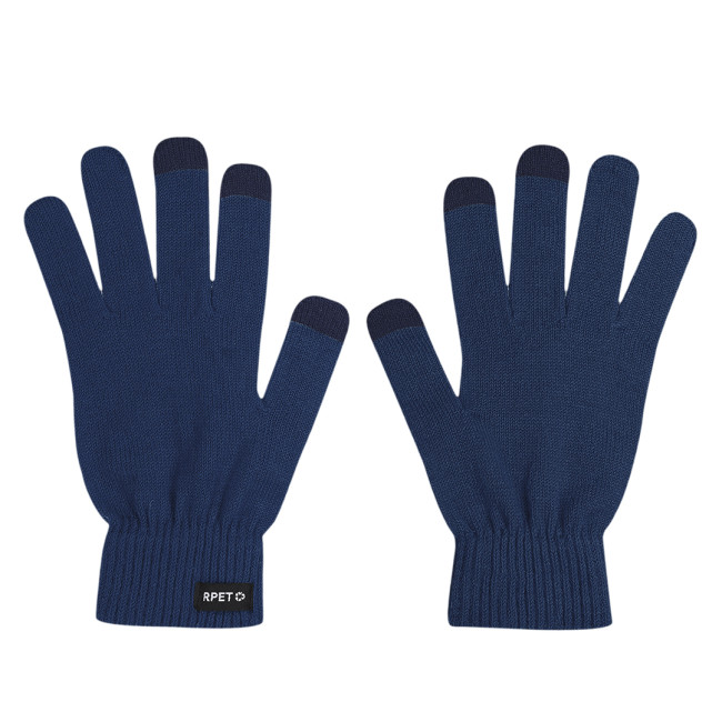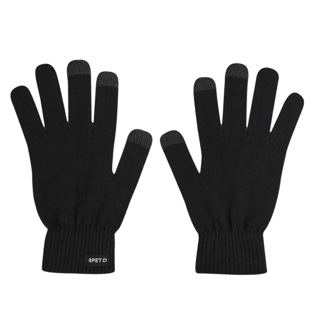 Guanti realizzati in tessuto di poliestere RPET, progettati per dispositivi touchscreen. Dotati di funzionalità touchscreen su dito medio, indice e pollice, sono caldi e morbidi, ideali per l'uso quotidiano. L'etichetta RPET sottolinea l'impegno verso la sostenibilità, contribuendo al riutilizzo dei rifiuti plastici.