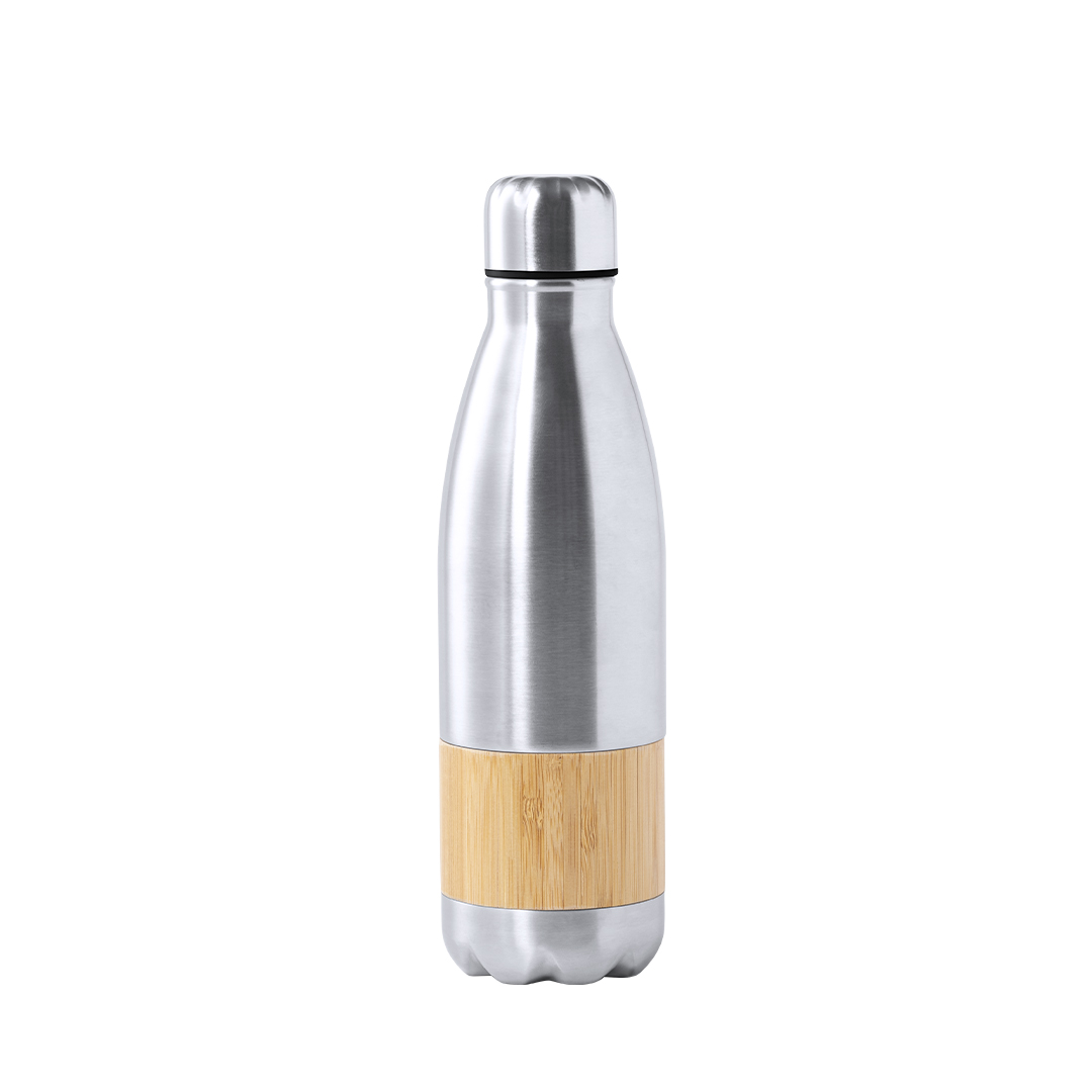 Borraccia della linea Natura, prodotta con una combinazione di acciaio inossidabile opaco e bambù. Capacità di 750ml, con tappo di sicurezza. Confezionata in attraente scatola eco-design.