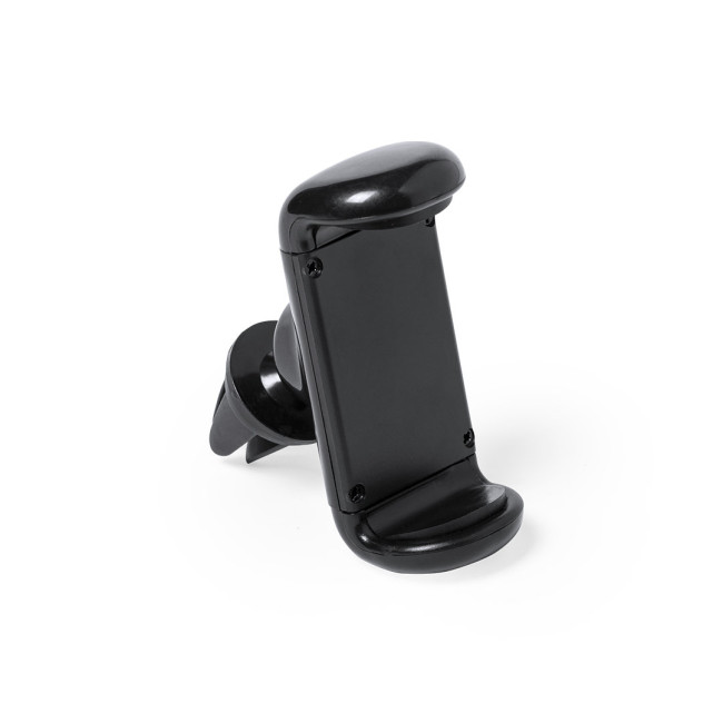 Supporto per smartphone regolabile con design minimalista, base girevole a 360º ed elegante finitura nera. Con sistema di fissaggio adatto alla griglia di ventilazione dell'auto e ampia superficie di stampa, appositamente pensata per la tampografia.