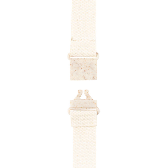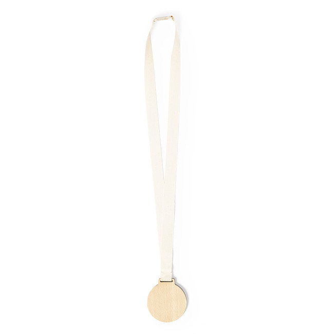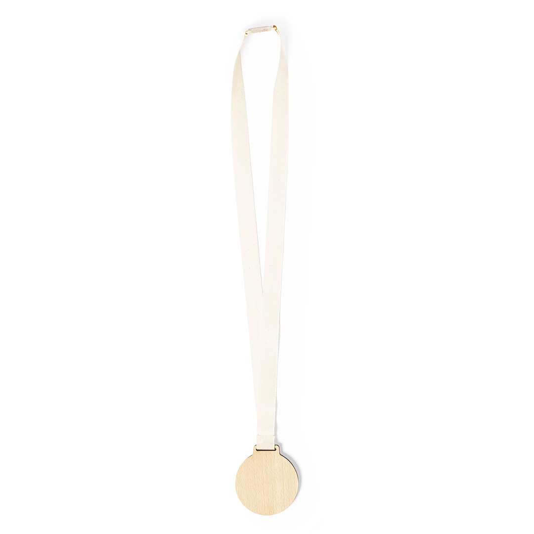 Medaglia della linea natura in legno naturale. Cordino in cotone, con chiusura di sicurezza al collo in fibra di grano.