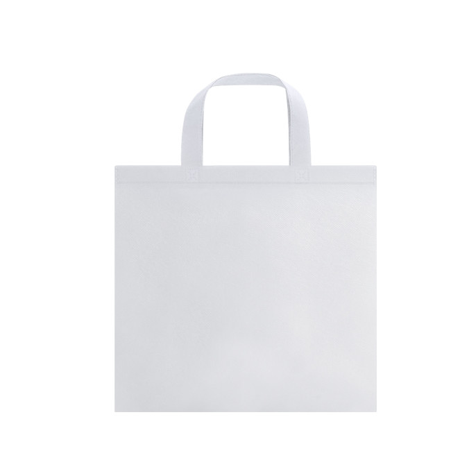 Borsa in TNT da 70 g/m2 di colore bianco, appositamente studiata per la stampa in sublimazione. Finiture termosaldate e manici corti rinforzati (36 x 3 cm). Resistenza fino a 6 kg di peso.