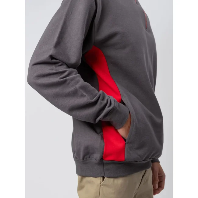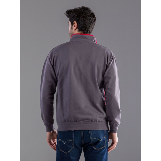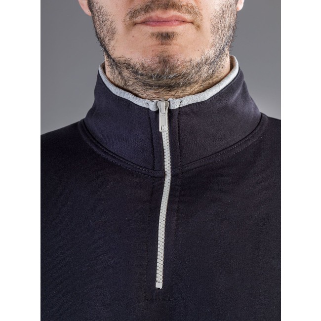 100% cotone. French terry. Felpa mezza zip bicolore parte interna del collo, fianchi, interno tasca e cerniera di colore contrastante. Struttura con cuciture laterali, maniche set-in.