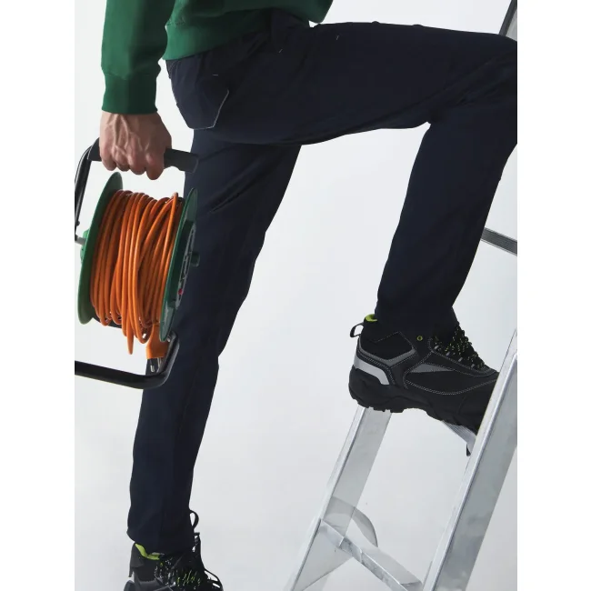 98% cotone, 2% elastane. Pantalone pesante multitasche elasticizzato, certificato CE CAT 1, tessuto prelavato, due tasche anteriori, una tasca laterale con Velcro, una tasca porta metro e portautensili, una tasca posteriore con Velcro. Inserto HiViz nel fianco e nel retro. Due cuciture anteriori sotto il ginocchio, elastici in vita e passanti maggiorati. Etichetta strappabile
