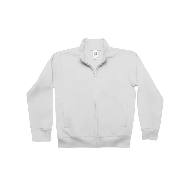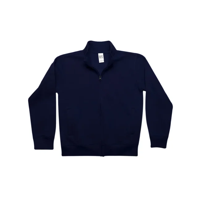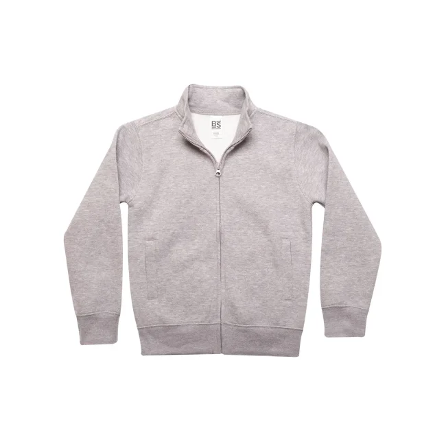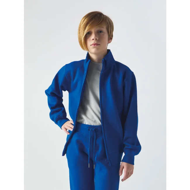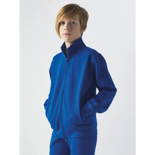 70% cotone, 30% poliestere. Felpa da bambino con maniche set-in, felpata internamente, zip intera, tasche a filetto, orlo inferiore e polsini con costina, struttura con cuciture laterali. Etichetta strappabile. Interno in poliestere ed esterno 100% cotone.