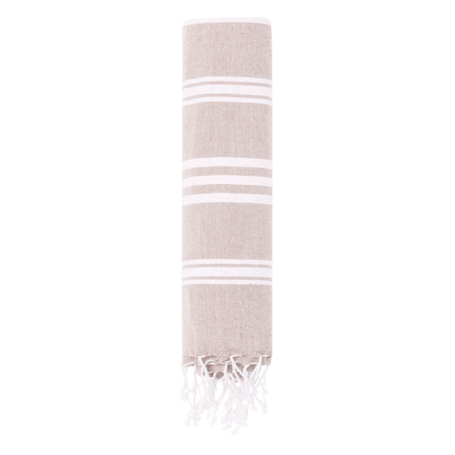 Morbido pareo asciugamano in una combinazione di cotone riciclato da 130 g/m2 sul davanti e poliestere da 125 g/m2 sul retro. Disponibili in una variegata gamma bicolore, con etichetta laterale. Presentato in borsa individuale.