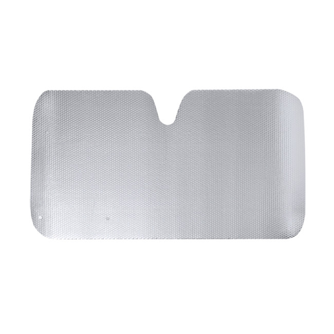 Parasole da auto in alluminio con bolle su entrambi i lati e dimensioni 130x70 cm. Finitura argento metallizzato, con design originale senza bordi. Facile e veloce da piegare, con chiusura a gancio e occhiello. Presentazione spiegata su piastra per una stampa ottimale, con buste separate.
