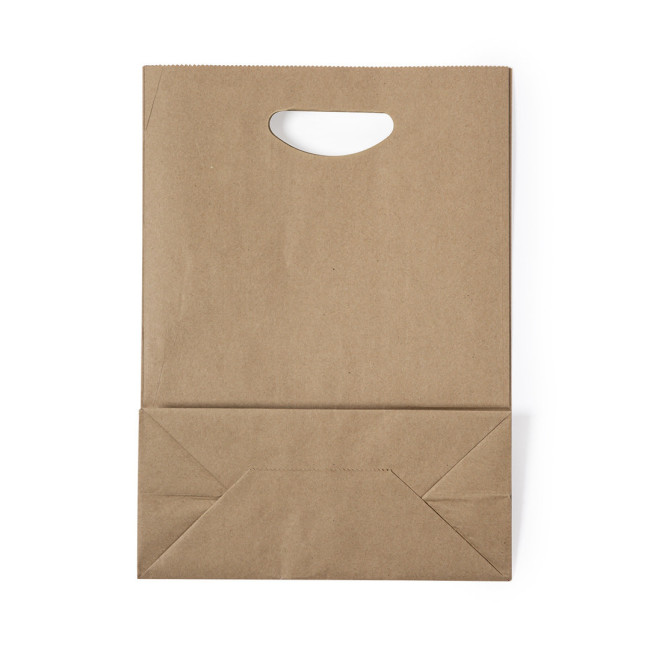 Borsa leggera della linea natura, realizzata in carta riciclata da 80g/m2. Con originali manici ritagliati e soffietto.