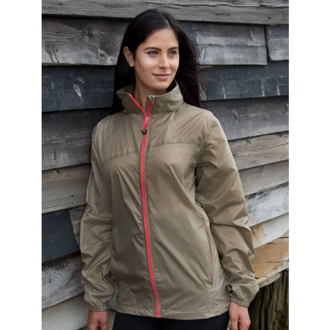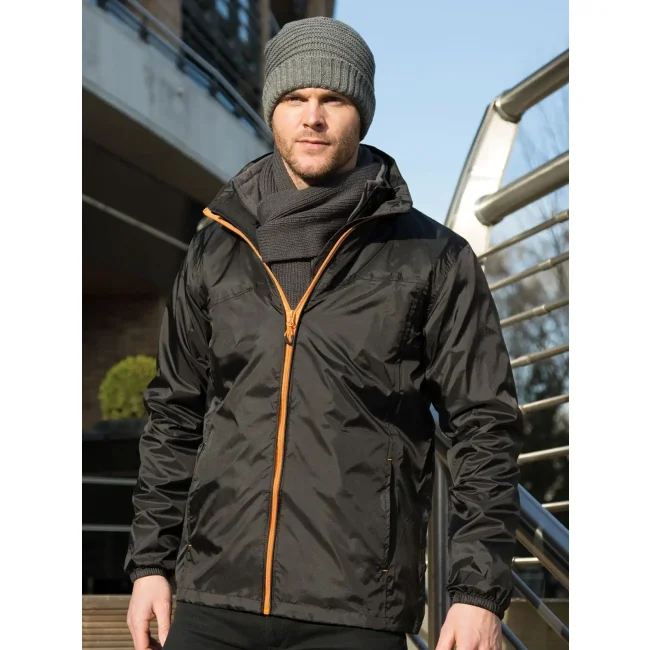 100% nylon. Giacca antivento, traspirante e impermeabile 3000mm. Zip frontale intera di colore contrastante, polsini elasticizzati, cappuccio a scomparsa, 2 tasche laterali di cui una con chiusura a zip. Cuciture nastrate.