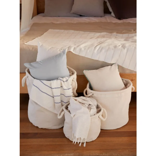 100% cotone canvas. Cesta con struttura solida e resistente, manici in corda per il trasporto. Etichetta removibile. Dimensioni: S: 30x30cm, cap. 21lt. - M: 40x40cm, cap. 50lt. - L: 40x60cm, cap. 75lt.