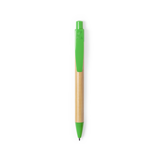 Penna della Linea Nature con meccanismo a pulsante. Fusto in bambù lucido e accessori in PLA - Acido Polilattico-, ottenuto da risorse naturali al 100% come amido di mais, yucca o canna da zucchero, compostabile al 100% al termine del suo ciclo di vita. Clip con ampia area di stampa, disponibile in un'ampia gamma di colori e con refill blu. Etichetta PLA sulla parte superiore della clip