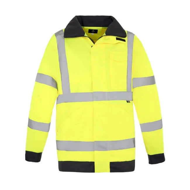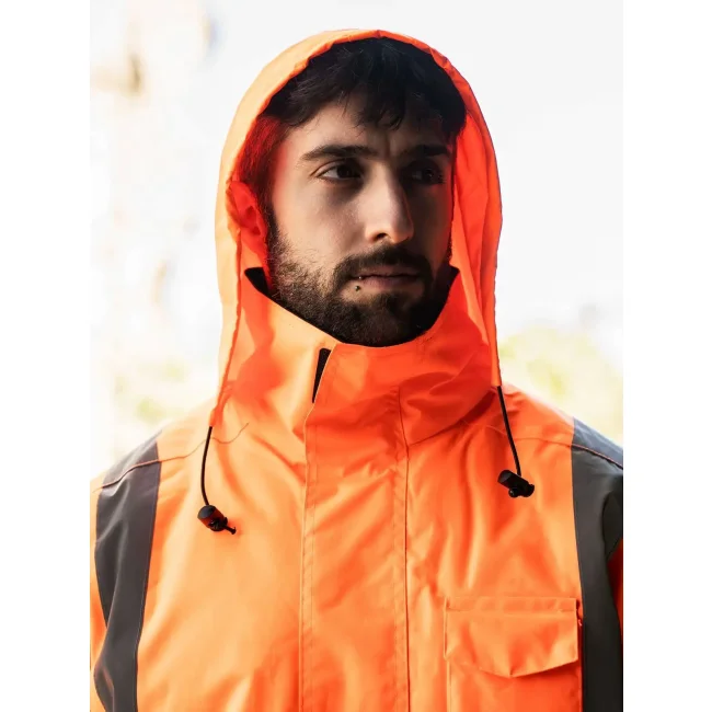 100% poliestere. Giacca antipioggia con rete interna 100% poliestere, bande riflettenti su busto e maniche, certificato secondo EN ISO ISO 20471:2013/A1:2016 Classe 3 e EM 343:2019, cerniera con patta antivento a tutta lunghezza, due tasche nascoste con entrata laterale e zip, tasca sul petto con chiusura in velcro, cappuccio a scomparsa, possibilità di ricamo/stampa su petto e schiena, polsini interni.