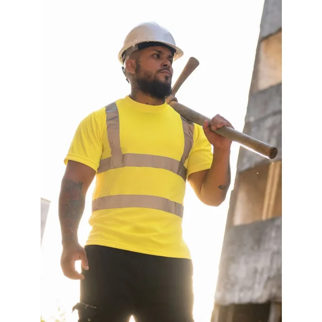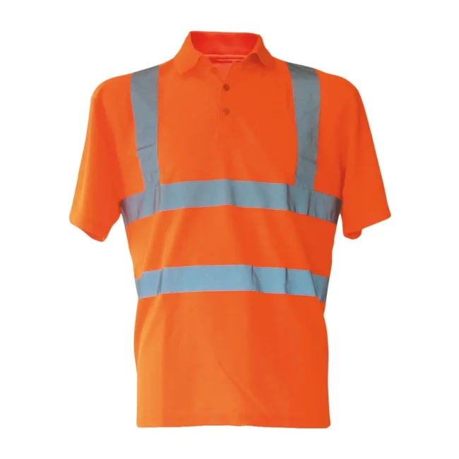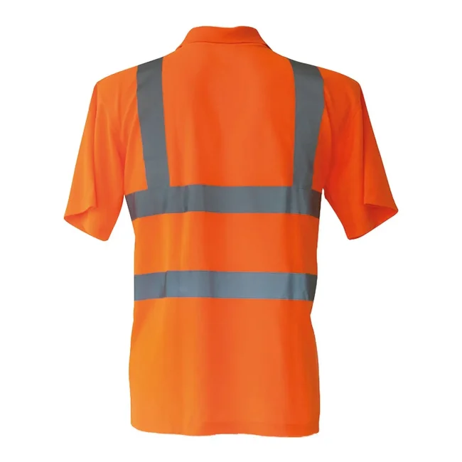 100% poliestere. Polo ad alta visibilità, certificazione EN ISO 20471:2013 + A1:2016, colore arancione conforme anche alla normativa GO/RT 3279, Oeko-Tex® Standard 100. Due fasce riflettenti larghe 5 cm intorno al corpo, due fasce riflettenti larghe 5 cm perpendicolari alle spalle, materiale morbido e traspirante, durata delle proprietà riflettenti in conformità alla normativa EN per 25 cicli di lavaggio a 40°C. Confezionato singolarmente in una pratica borsa in polietilene.