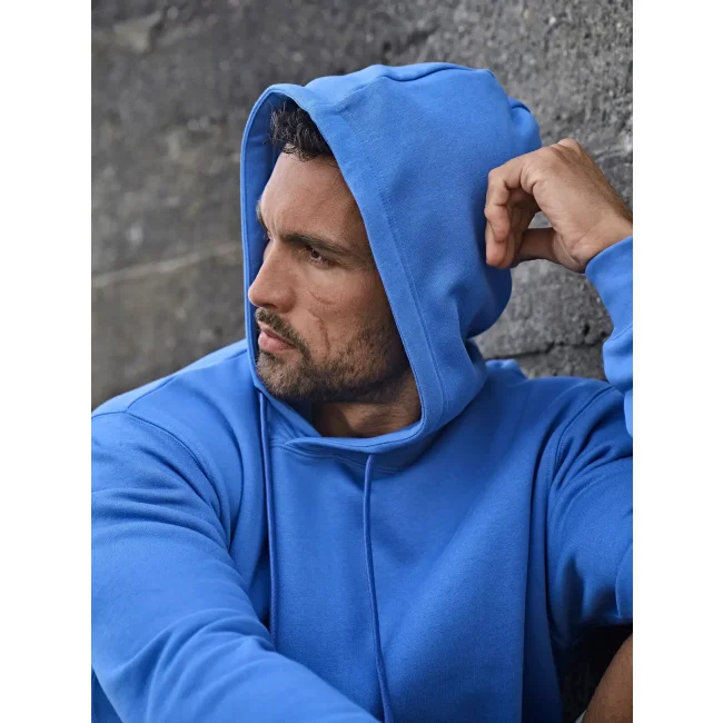 70% cotone ringspun, 30% poliestere. Felpa con cappuccio di peso elevato, dotata di un'ampia tasca a canguro e di un cappuccio regolabile. Polsini e fascia doppia cucitura con elastane. Tessuto a 3 fili. Felpata internamente.