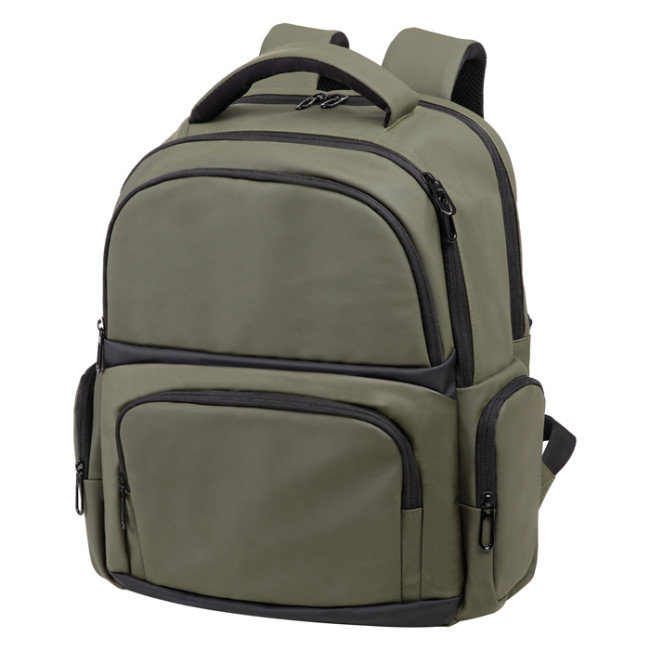 zaino in pu soft touch waterproof 2 tasche imbottite portac pc e tablet 2 vani principali 2 tasche laterali con chiusura a zip tasca interna multifunzione spallacci e schienale imbottito con materiale traspirante fascia trolley sul retro