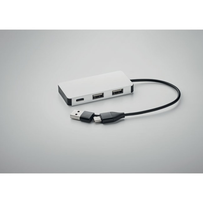 Cavo di ricarica in alluminio riciclato. Uscita: 2 x Tipo A e 1 x Tipo C. Ingresso: tipo C e tipo A 2 in 1. Lunghezza cavo: 20 cm.