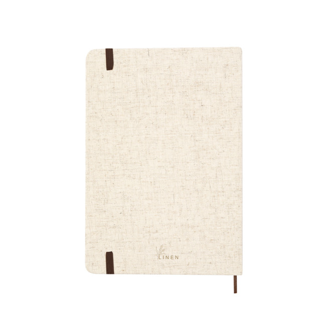 Taccuino in morbido lino. Con copertina rigida, segnalibro, elastico marrone e 80 fogli lisci in colore naturale. Con logo Lino sul retro della copertina. Presentato in una busta individuale. Realizzato con elementi vegetali per promuovere l'uso di materie prime naturali e ridurre le emissioni inquinanti.