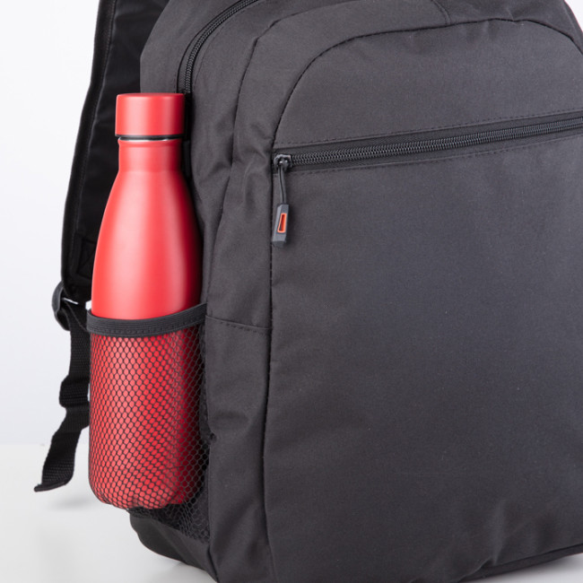 zaino in poliestere 300D vano imbottito interno porta pc tasca frontale con cerniera e tira lampo spallacci imbottiti e regolabili tasca laterale in materiale traforato laptop fino a 15"
