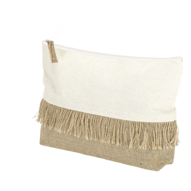 Necessaire in combinazione di juta laminata e cotone naturale. Con distintivi frange, chiusura con cerniera di colore naturale e tirante in juta.