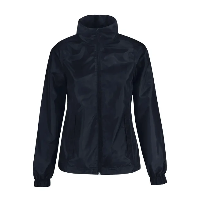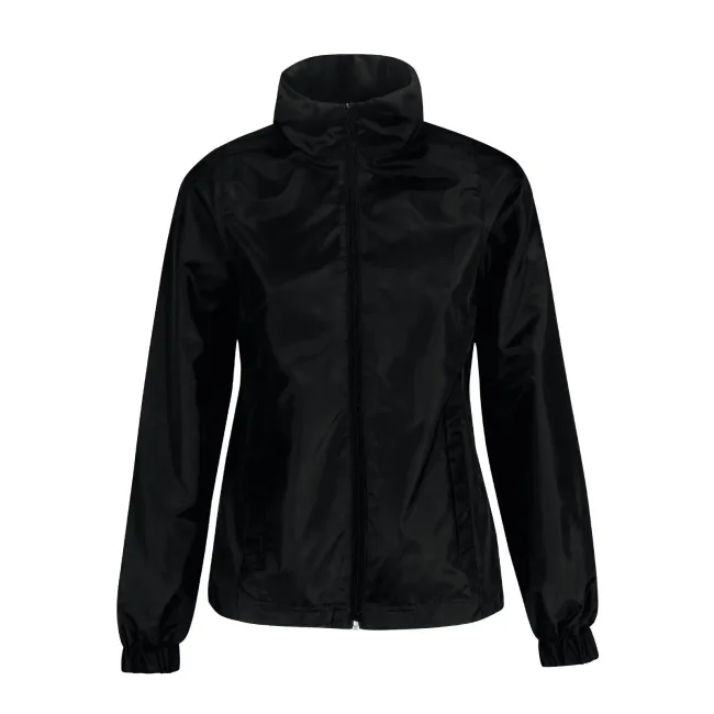 100% poliestere . Giacca antivento e antipioggia, termoisolante e idrorepellente, esterno poliestere 210T taffetà, interno 100% poliestere tricot. Taglio femminile. Cappuccio ergonomico a scomparsa, due tasche frontali e taschino interno.