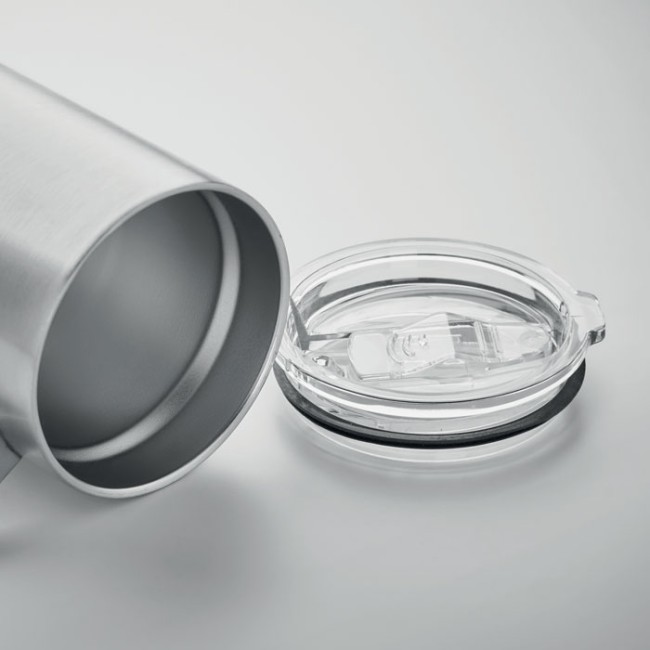 Tazza a doppio strato in acciaio inox riciclato (90% acciaio inox riciclato e 10% acciaio inox) con coperchio scorrevole. Capacità: 300 ml.