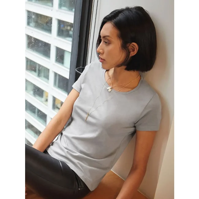 100% cotone organico o organico in-conversion ring-spun. T-shirt maniche corte, girocollo sottile, cuciture rinforzate su collo e spalle rinforzate, morbida al tatto, struttura con cuciture laterali, leggermente sfiancata, nessuna etichetta. SG620: 90% cot. 10% visc.