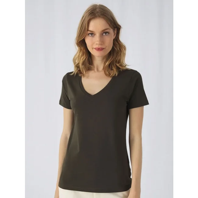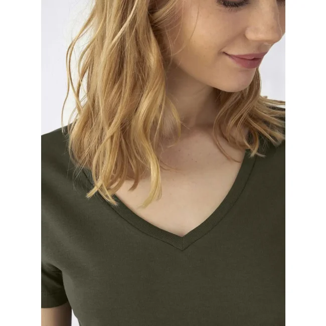 100% cotone organico o organico in-conversion ring-spun. T-shirt manica corta, set-in, scollo a V con bordino sottile, morbida al tatto, cuciture al collo e spalle rinforzate, struttura con cuciture laterali, leggermente sfiancata, nessuna etichetta.