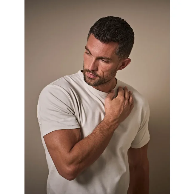100% cotone organico pettinato ringspun. T-shirt uomo con vestibilità sagomata e collo sottile a costine in lycra, doppie cuciture, lavaggio enzimatico e lavaggio in silicone, cotone a fibra lunga, lavabile a 60 gradi.