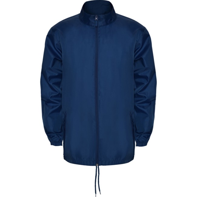 Impermeabile con:.Collo alto e cappuccio rimovibile con cordoncini regolabili.Cerniera centrale con estrattore.Due tasche laterali con cerniera e patta.Polsini elasticizzati.Girovita a costine con coulisse regolabile all'interno.Tasca interna con elastico per piegare e riporre.