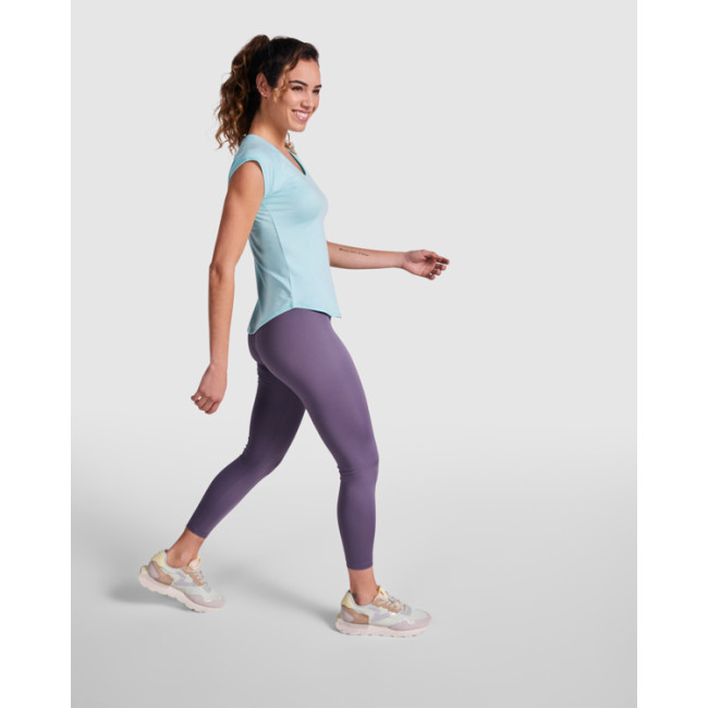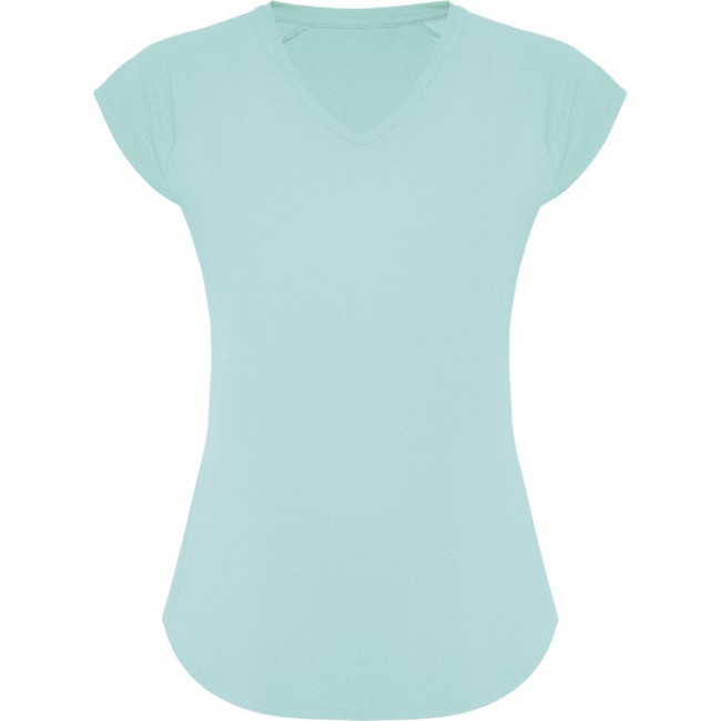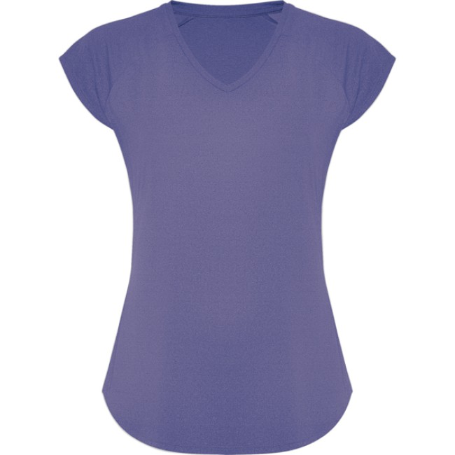 T-shirt tecnica multisport da donna con maniche raglan. Scollo a V. Tessuto in poliestere con tocco di cotone. Taglio aderente. Orlo curvo. Cuciture overlock tono su tono su orlo e maniche. Logo Roly riflettente sull'orlo laterale sinistro.