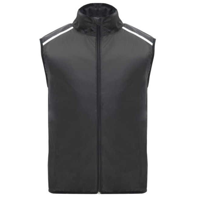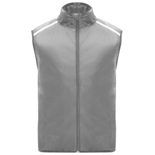 Gilet antivento ultraleggero. Zip frontale tono su tono. Mentoniera. Schienale in tessuto traspirante. Strisce riflettenti sul davanti e sul retro delle spalle per una maggiore visibilità. Giromanica ed orlo con bordatura elastica in tinta. Tasca laterale sinistra per riporre gli oggetti.