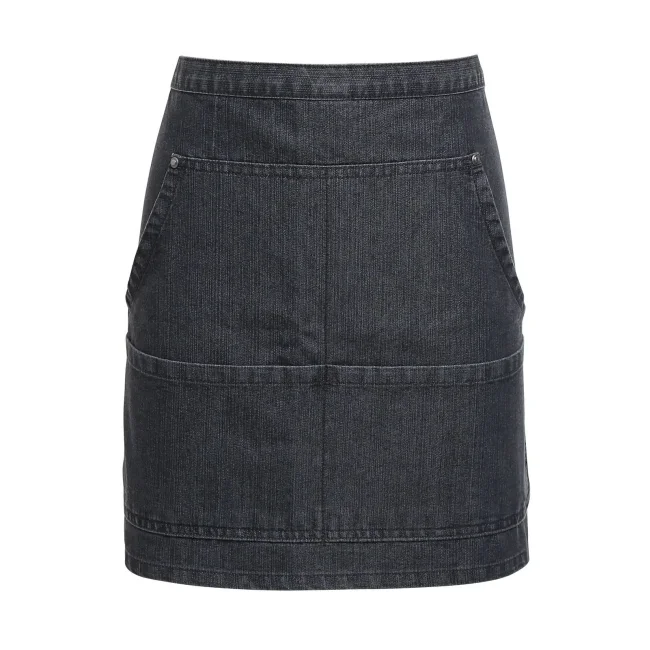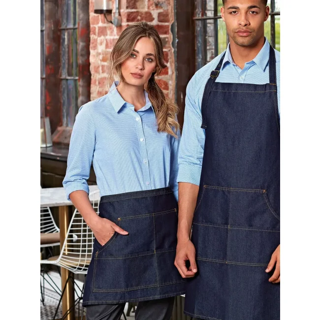 70% cotone, 30% twill di poliestere. Grembiule in denim stile bar, cuciture a contrasto, inserti in rame, quattro tasche, cordino per chiusura (106 cm). Lavabile a 60°C.
